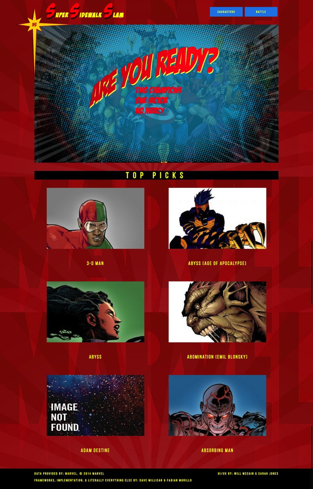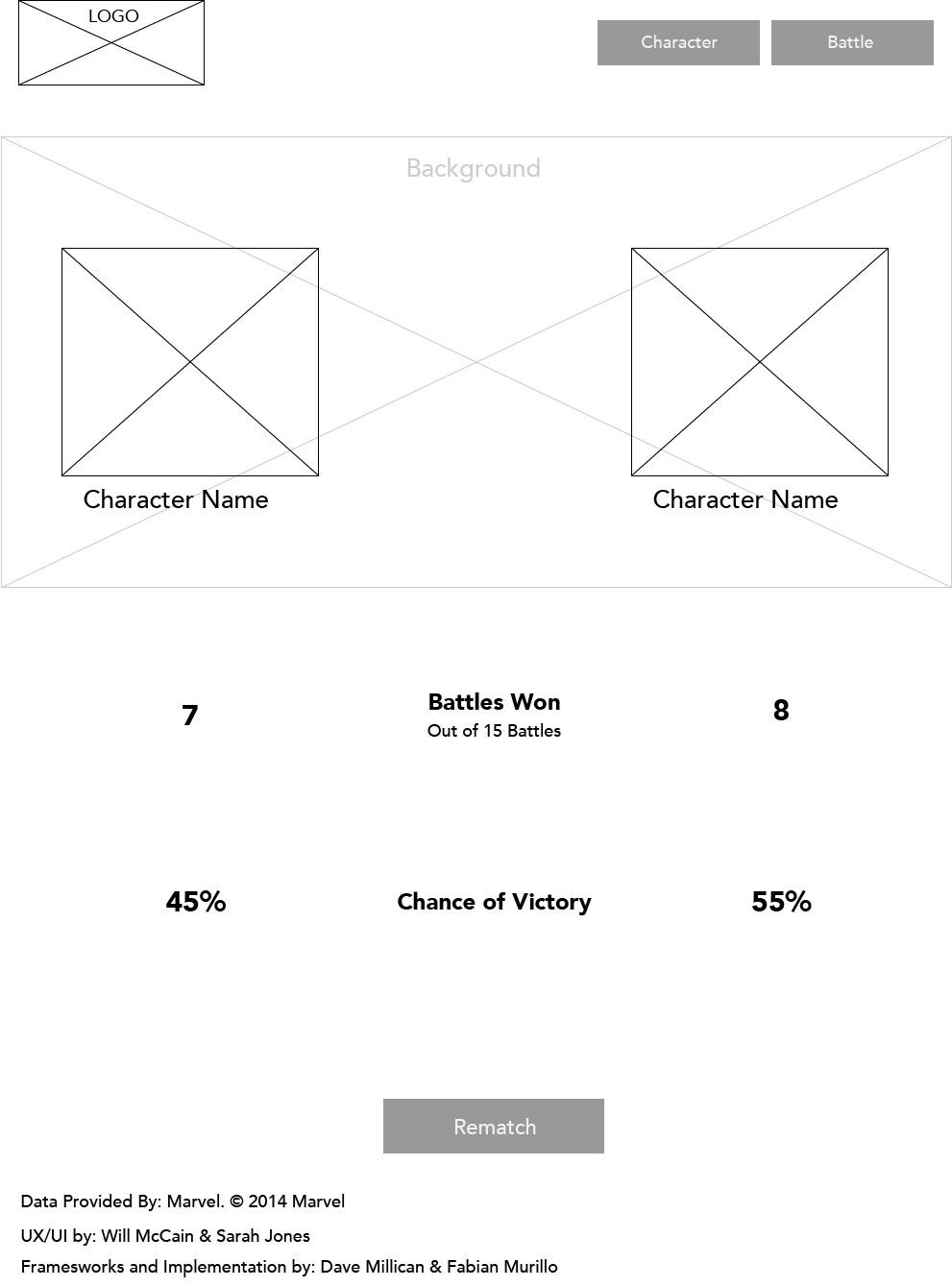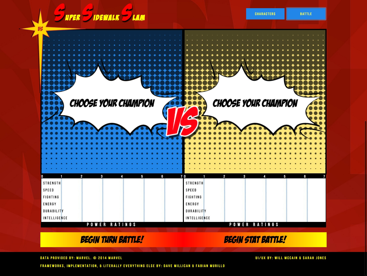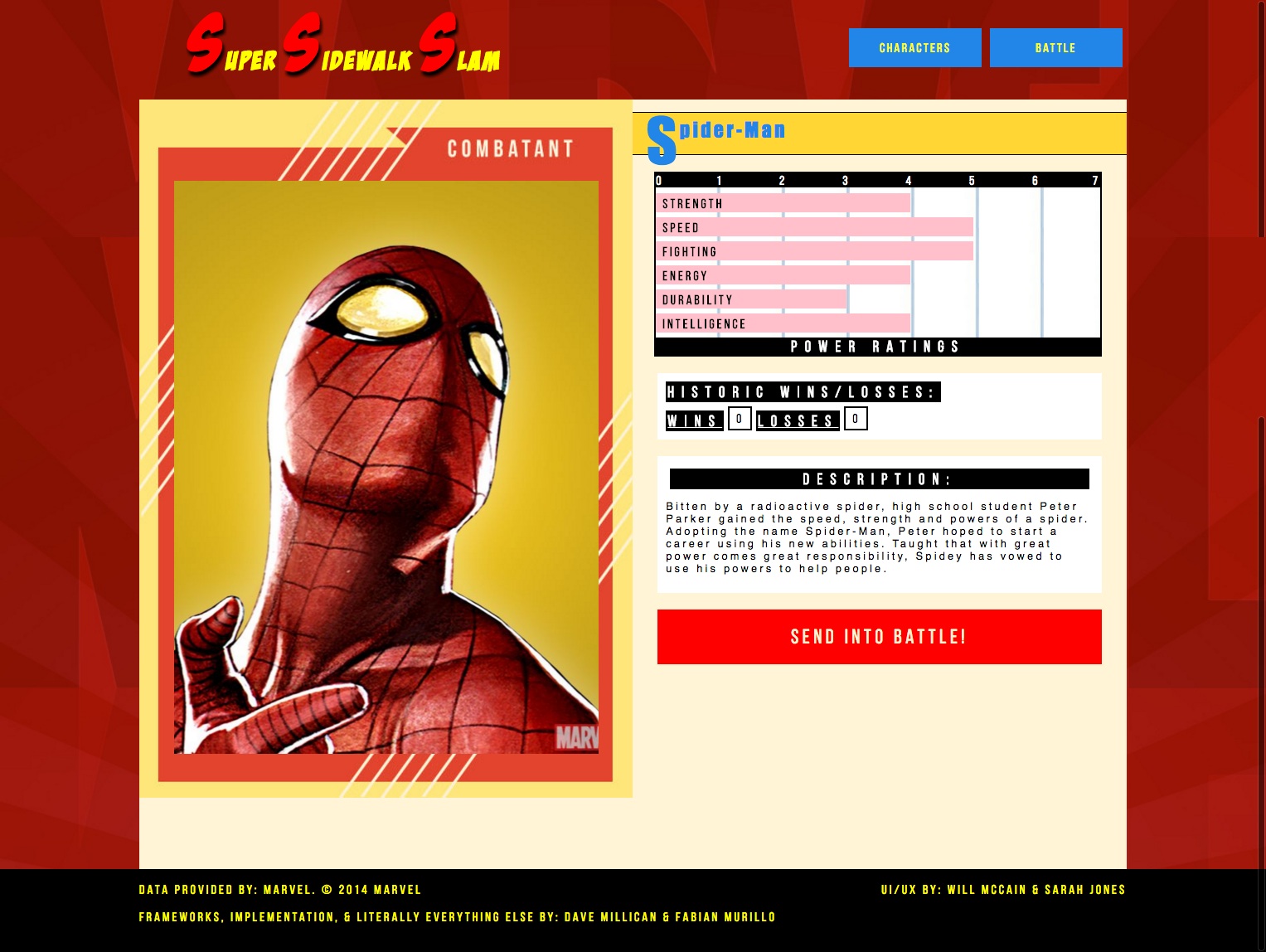 As a collaborative project, I, along with another designer and some developers, were tasked with designing and building a web app that would let you simulate fights between Marvel characters. We would be pulling the pictures, information, and ability stats from Marvel's very handy online API.