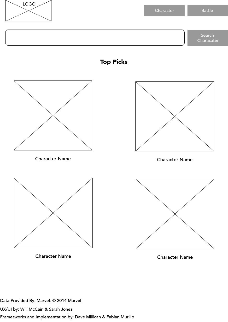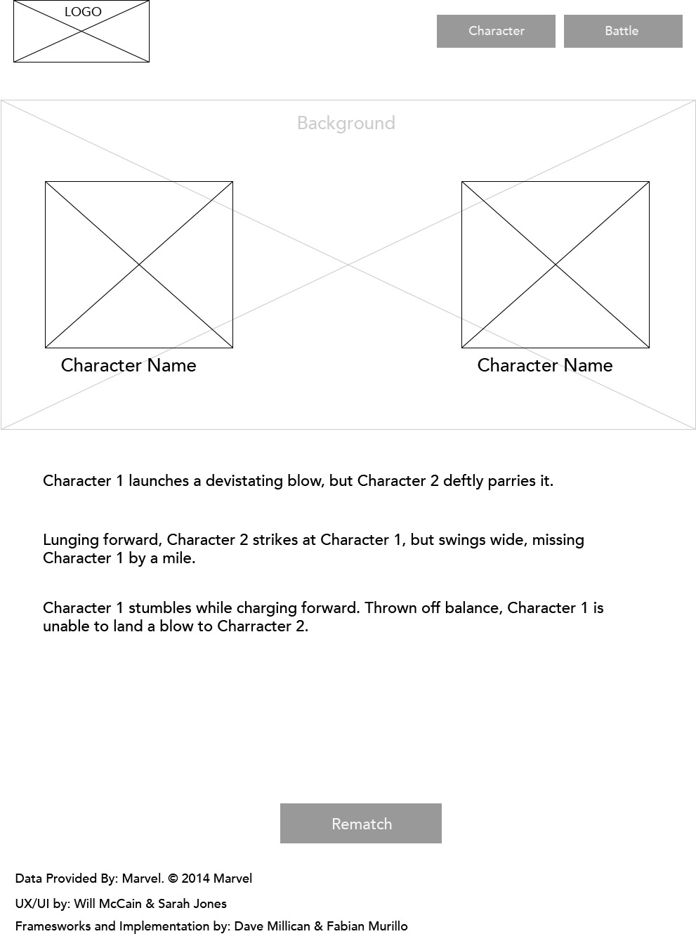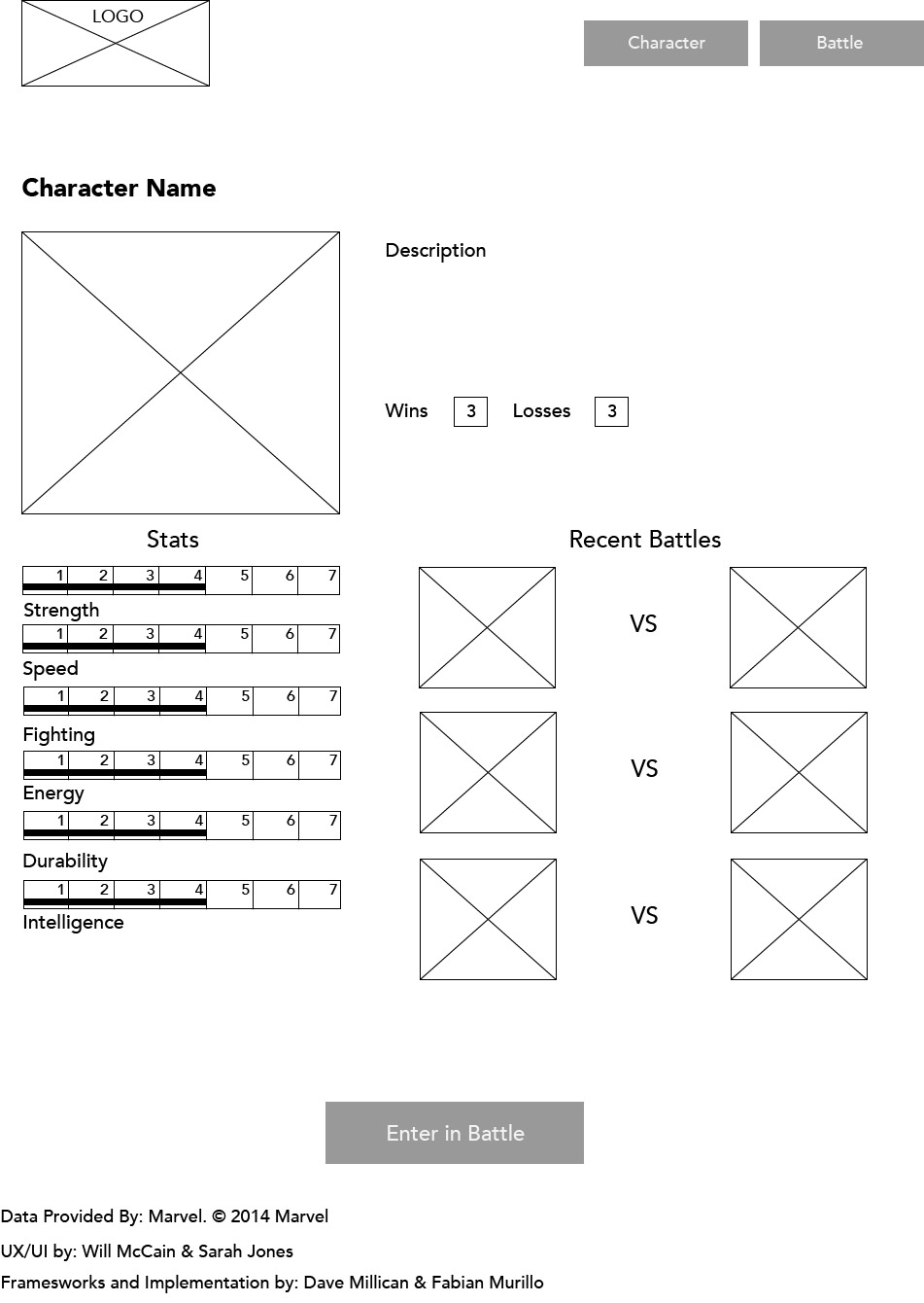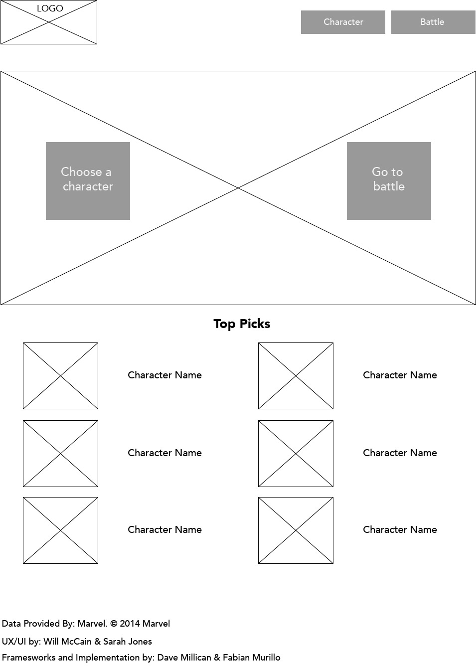 As a collaborative project, I, along with another designer and some developers, were tasked with designing and building a web app that would let you simulate fights between Marvel characters. We would be pulling the pictures, information, and ability stats from Marvel's very handy online API.